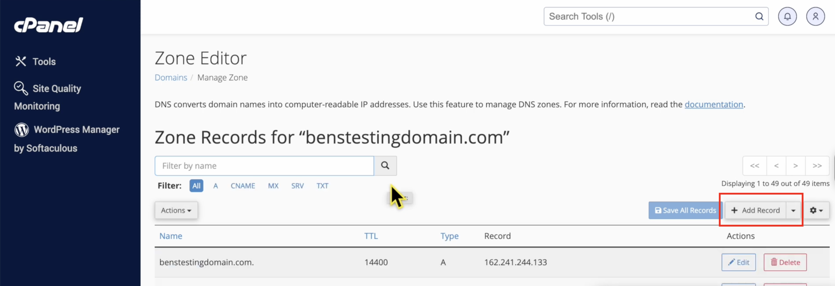 2. Inside CPanel, locate the option to **Add Record**.
